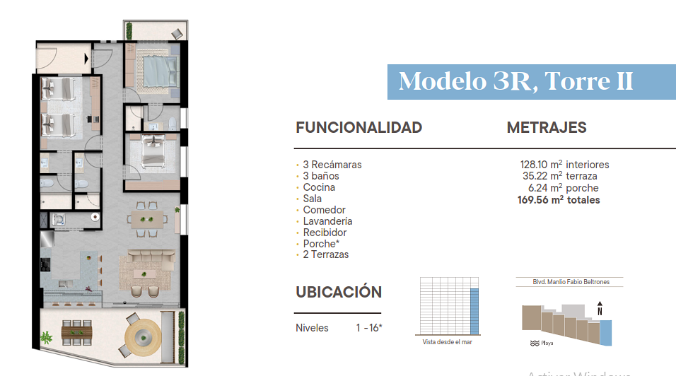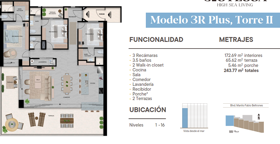 6 elevadores, Accseso directo a la playa, estacionamiento multinivel,